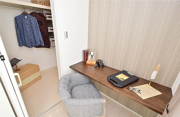 リビングを見渡せる場所に、スキップフロアのテレワークスペースを設けました。上部は吹抜で開放感たっぷり!程よい広さで落ち着ける空間に。横に並んで座ることができるので、お子様と一緒に使えます◎