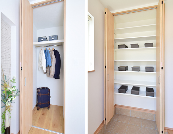 棚の高さを自由に変えられる玄関収納に加え、パイプ付きの収納を設置することで、使用頻度の高いアウターやカバンを収納でき、身支度が時短になります♪