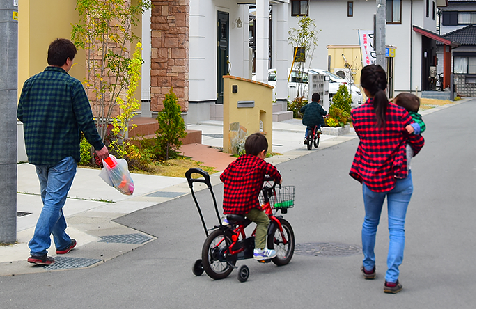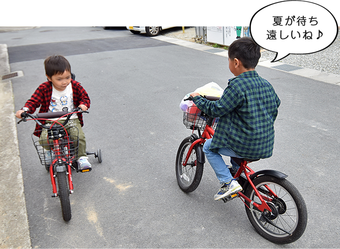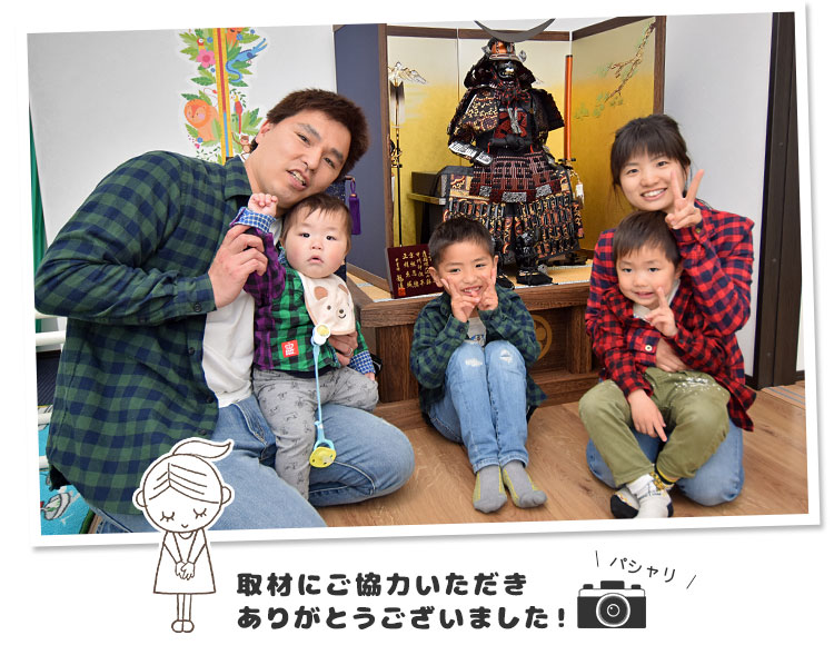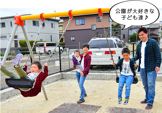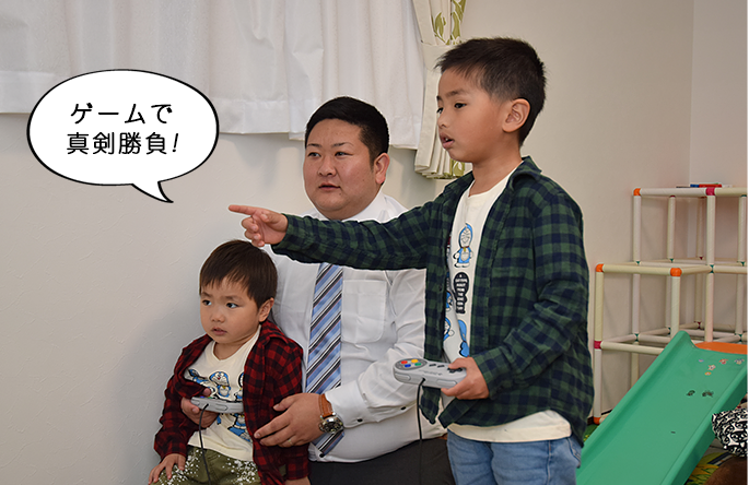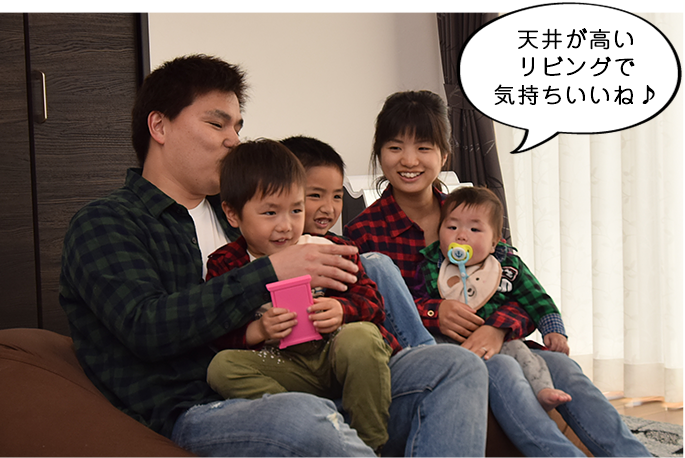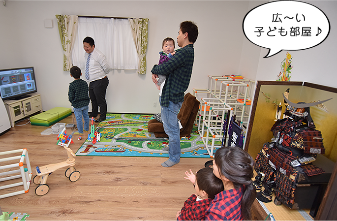 リビング横に広い子供部屋。門柱に家族5人の手形。