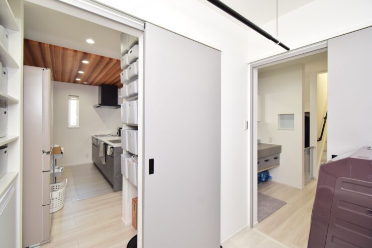 間取りの面では、たっぷりの収納に加え、家族が入浴中でも気兼ねなく使えるよう洗面室と脱衣室を分けています。