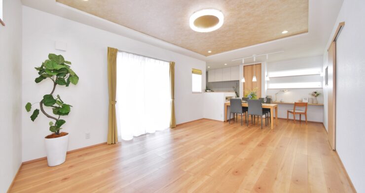 ダイニング・リビングは、キッチンが張り出さない分、実際の帖数以上に広がりを感じられる広々空間になっています。