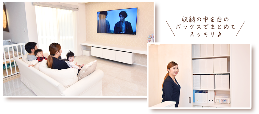 収納もたくさん作り、テレビも壁掛けにする事で家が片づきスッキリしました。 和室コーナーを作る事で子どものお昼寝も見える場所でする事ができています。